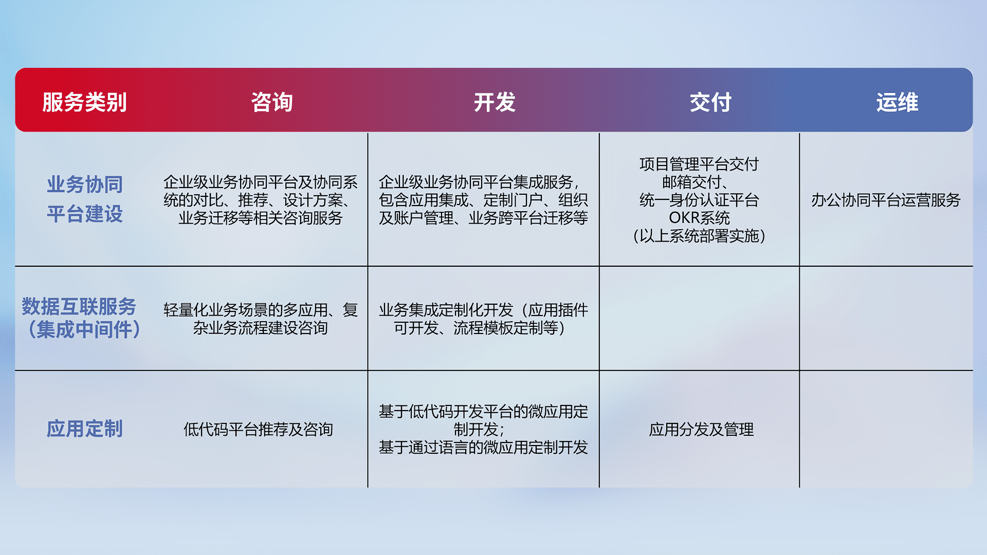 针对钉钉、、企微、、IDaas等平台级产品提供产品的规划、、方案、、、交付、、、定制化开发等服务,,,,实现如统一协同办公、、智能客户服务、、、、混合会议管理、、智能数据查询、、等业务场景,,实现数字化转型。。