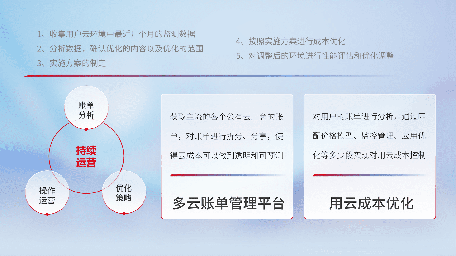 通过多云纳管,,,,以统一的资源数据模型把客户的云资源进行抽象和封装,,进而实现对多云资源的统一操作,,,保障云资源管理的可靠性、、、、稳定性与可用性。。量身定制化运维内容,,配置、、、开发运维、、、、补丁管理、、、备份、、监控、、、、认证和访问管理、、审计和日常巡检等,,,保障在用云过程中的可靠度,,,稳定度以及高可用率。。。